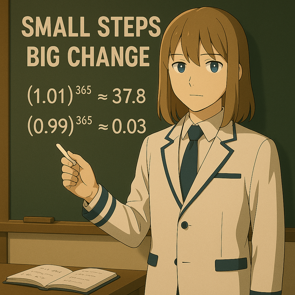 成長は一気に起きるものではなく、毎日の小さな積み重ねによって生まれます。たとえ1日わずか1%の成長でも、積み重ね続ければ1年後には37倍、3年後には56,000倍以上の差に広がります。